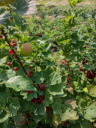 De tuin, ca. 2000 m², heeft als basis een gelaagde bosranden, namelijk een rij fruitbomen, ernaast een rij bessenstruiken en vaste planten zoals groene asperges.