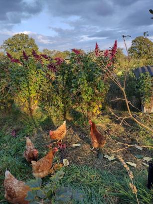Een aantal kippen bewonen het kipmobiel. Zij scharrelen de grond los, eten slakken(eitjes), andere insecten en onkruid zaden. Ondertussen bemesten ze de grond. Zo zijn ze onderdeel van èn bouwen ook zij mee aan meer evenwicht en opbouw van de bodem en het hele agro ecologiesche systeem, waarin ze steeds een nieuw stukje ʺtuinʺ tot hun beschikking krijgen. Kort gezegd, natuur inclusieve kippen.